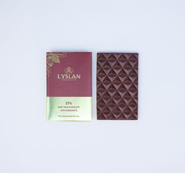 Sô-cô-la sữa Lyslan hòa quyện cùng hạt tổng hợp giòn bùi từ Bình Phước và Lam Đồng, tạo nên sự kết hợp hoàn hảo giữa vị mượt mà và giòn tan.