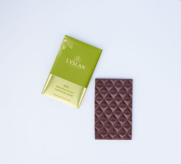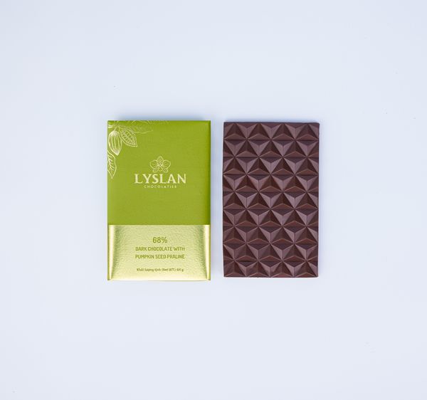 Sô-cô-la đen đậm đà của Lyslan kết hợp hạt bí giòn từ đồng bằng sông Cửu Long, tạo nên hương vị mạnh mẽ, khó cưỡng.
